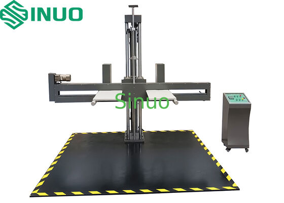 The machine conducts vertical free-fall impact tests on the specimen. The specimen can be dropped freely on its faces, edges, or corners, and the drop height can be preset. Once the specimen reaches the set height, the lifting mechanism stops automatically and holds the position. The distance between the supporting arms can be adjusted electrically according to the product size.